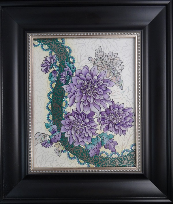 8x10" tile White Velvet carved background, porcelain beads, mother of pearl embellishments, silver trim & Glo Glass in 12.5x15.5" black frame